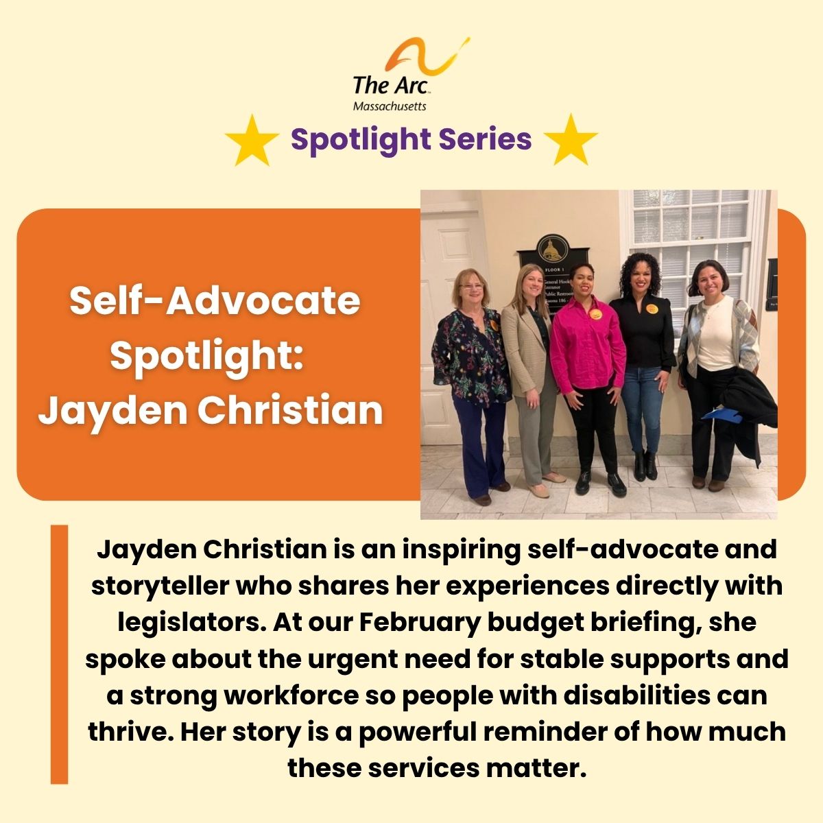 Jayden Christian is a dedicated self-advocate and an incredibly compelling speaker who shares her lived experience to advocate for individuals with IDD and autism. She engages directly with legislators and spoke at our February budget briefing, highlighting the urgent need for stable supports and a strong workforce.